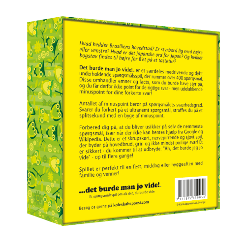...det burde man jo vide! er et særdeles medrivende og dybt underholdende spørgsmålsspil, der rummer over 400 spørgsmål. Disse omhandler emner og facts, som du burde have styr på, og du får derfor ikke point for de rigtige svar - men udelukkende minuspoint for dine forkerte svar!